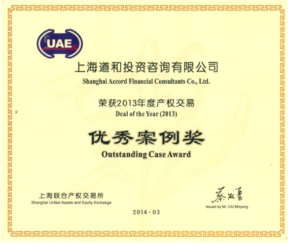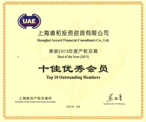 在2014年5月15日召開的上海聯(lián)合產(chǎn)權(quán)交易所2014年度會(huì)員大會(huì)上,我司因經(jīng)營(yíng)業(yè)績(jī)突出、業(yè)務(wù)質(zhì)量?jī)?yōu)異,再次榮獲“十佳優(yōu)秀會(huì)員獎(jiǎng)”和“優(yōu)秀案例獎(jiǎng)”。我司董事長(zhǎng)陳悅先生還在會(huì)上代表上海聯(lián)合產(chǎn)權(quán)交易所會(huì)員單位做了題為《以專業(yè)化、市場(chǎng)化的服務(wù)為產(chǎn)權(quán)市場(chǎng)做貢獻(xiàn)》的交流發(fā)言。